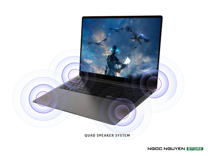 Samsung Galaxy Book3 Ultra được trang bị hệ thống âm thanh chất lượng cao, giúp cho người dùng thư giãn thông qua bài nhạc sau một ngày dài làm việc mệt mỏi. Sản phẩm còn có hai loa Quad AKG và Dolby Atmos, âm thanh được truyền tải rõ ràng từng nhịp bass, nhịp trống.