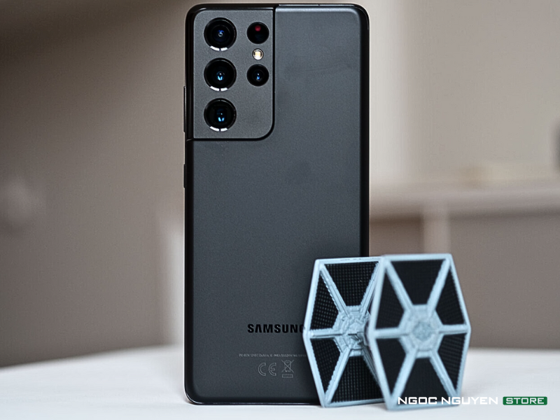 Mặt sau của Samsung Galaxy S21 Ultra 5G nổi bật với cụm mô-đun 4 camera được trang bị đèn flash LED và hỗ trợ lấy nét bằng laser.