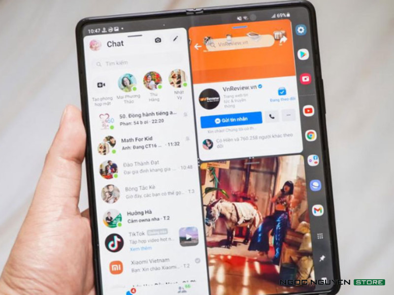 Z Fold3 chính là chiếc điện thoại Samsung đầu tiên sử dụng công nghệ camera selfie ẩn dưới màn hình gập, đem tới khả năng hiển thị siêu tràn viền gần như không có khiếm khuyết, những tác vụ trên Samsung Galaxy Z Fold3 đều hiển thị một cách trọn vẹn sắc nét, từ vào mạng xã hội, lướt web cho đến xem phim, chơi game.